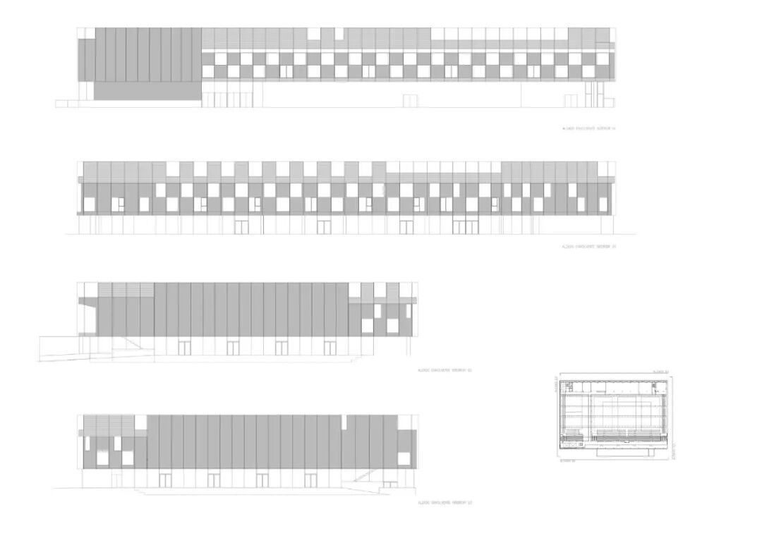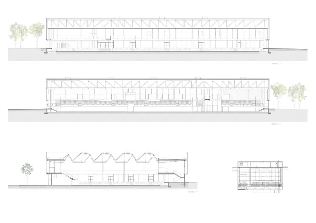 This spatial organization of uses at the same time offers great versatility in the management of the building, by allowing each of the main uses (pavilion, gym, and cafeteria) to function independently. The facades of the building are configured as a dynamic system in permanent change, in which the superposition of two different geometries, horizontal striping on the exterior leaf and checkerboard on the interior leaf, alternate with greater or lesser intensity depending on the nuances of the interior and exterior lighting.