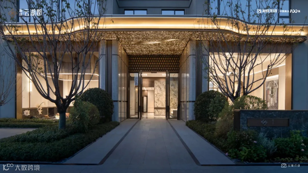 楼栋门厅也更现代流畅,金属格栅与蚀刻的大象灰石材从底至顶拉出竖向线条,大象灰石材圆弧导角在大门两边卓立,恰似数字11。
