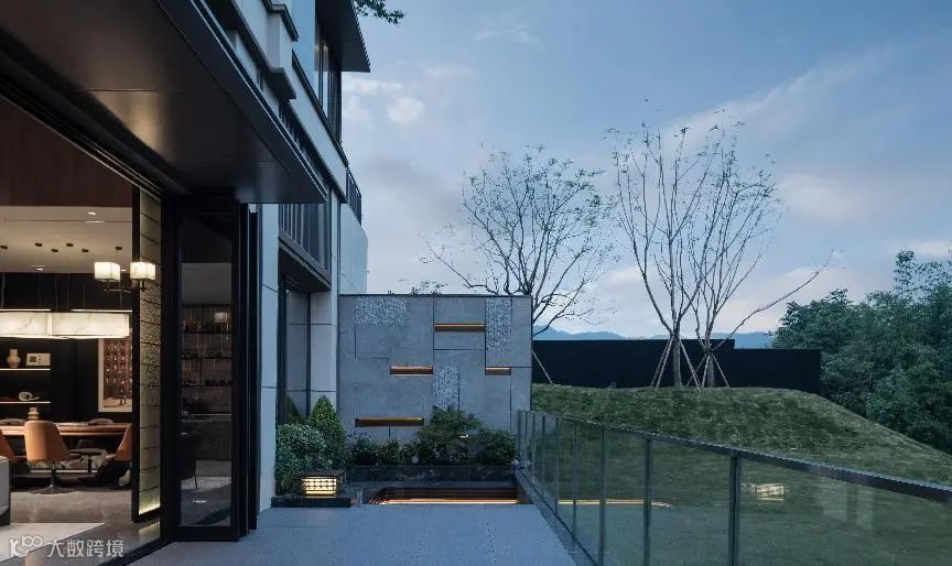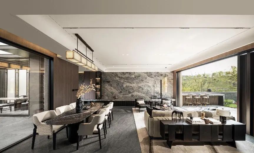 落地高窗后,会有一座约6米高差的立体无界山水艺术庭院扑面而来。溪瀑在切割如钻石的石头上蜿蜒而下,让整个蓊郁苍翠的庭院产生了禅意。