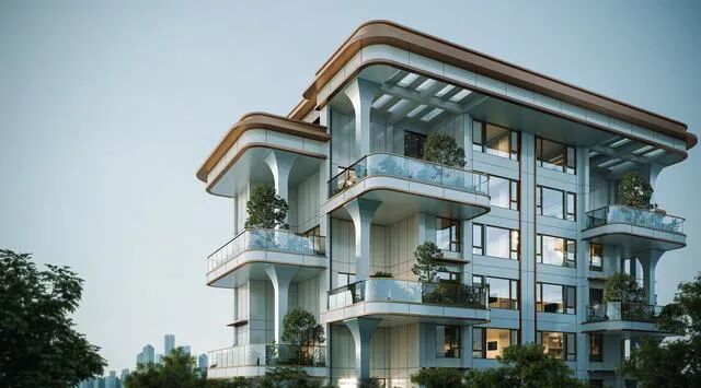 立面已有部分呈现,外挑的金色门檐、隽永的深灰底、银白+香槟金的弧形腰线,那枚「鎏金花瓣」镶了一圈深蓝色晶莹剔透的「花边」,自平面中撑开新天地。