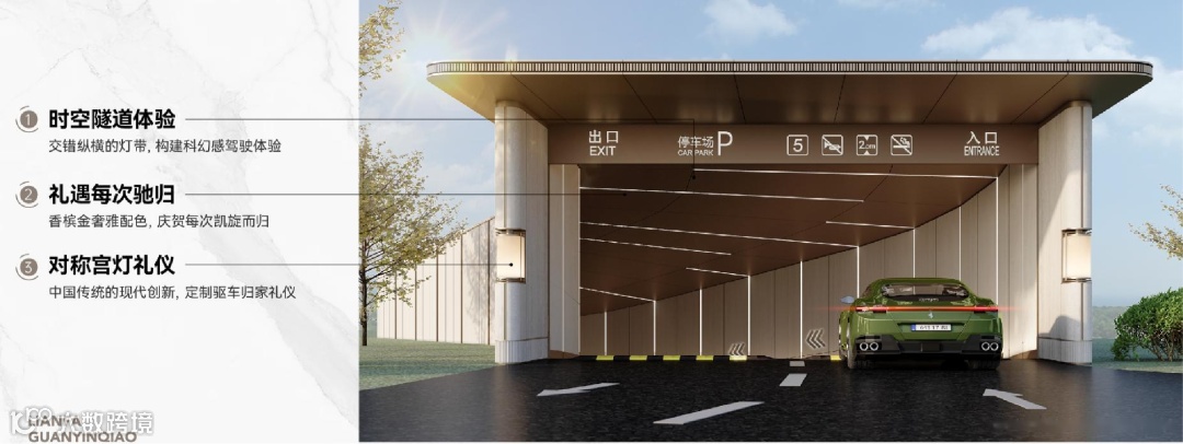 约56米宽,恢弘界面;致敬世界建筑大师密斯凡德罗经典作品“德国馆”,以“less is more”的现代主义建筑理念,历经10余次设计打磨,营造简练且精致的国际化归家界面。