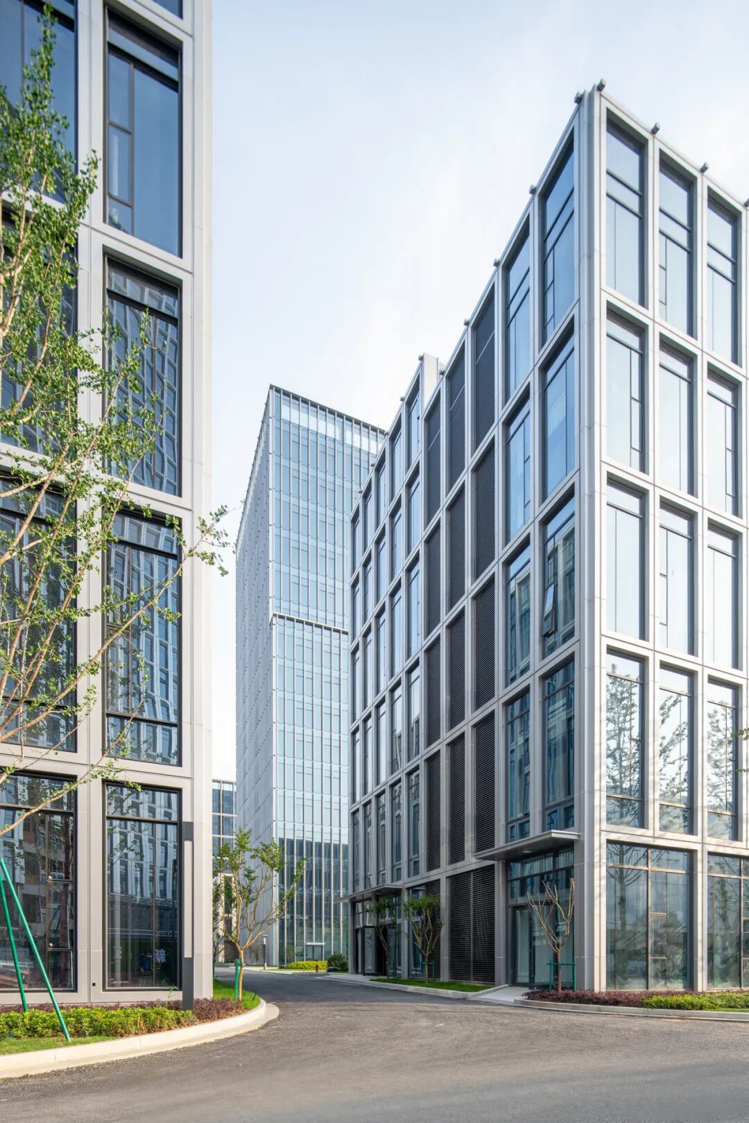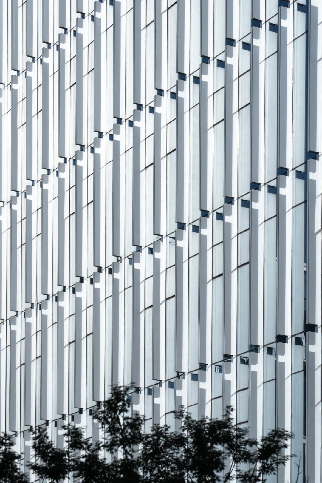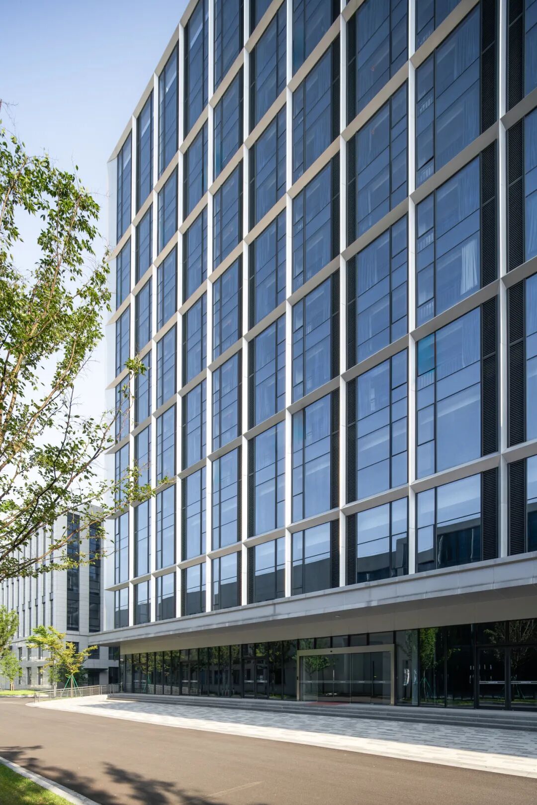 办公主楼立面通过金属格栅形成强烈的纵向秩序,使得建筑更显挺拔。
