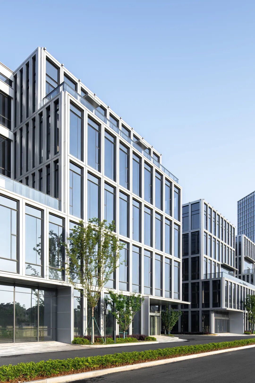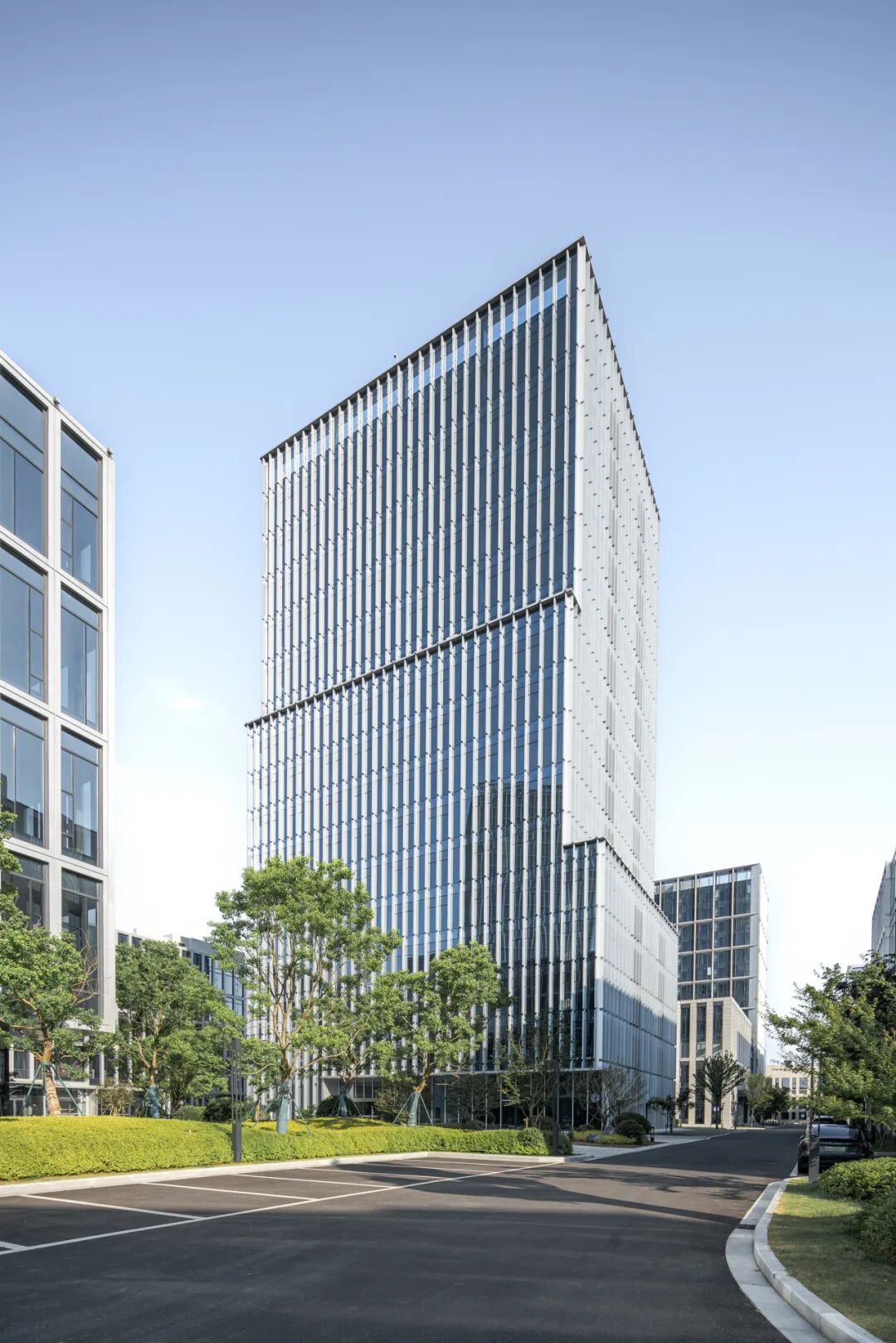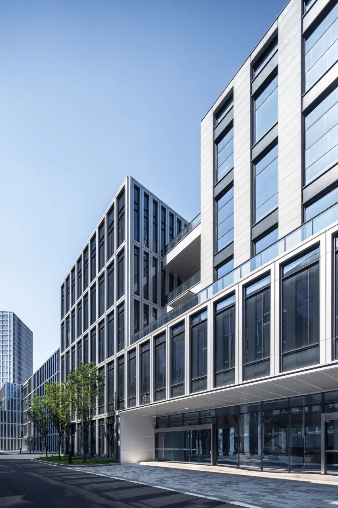 办公主楼立面通过金属格栅形成强烈的纵向秩序,使得建筑更显挺拔。