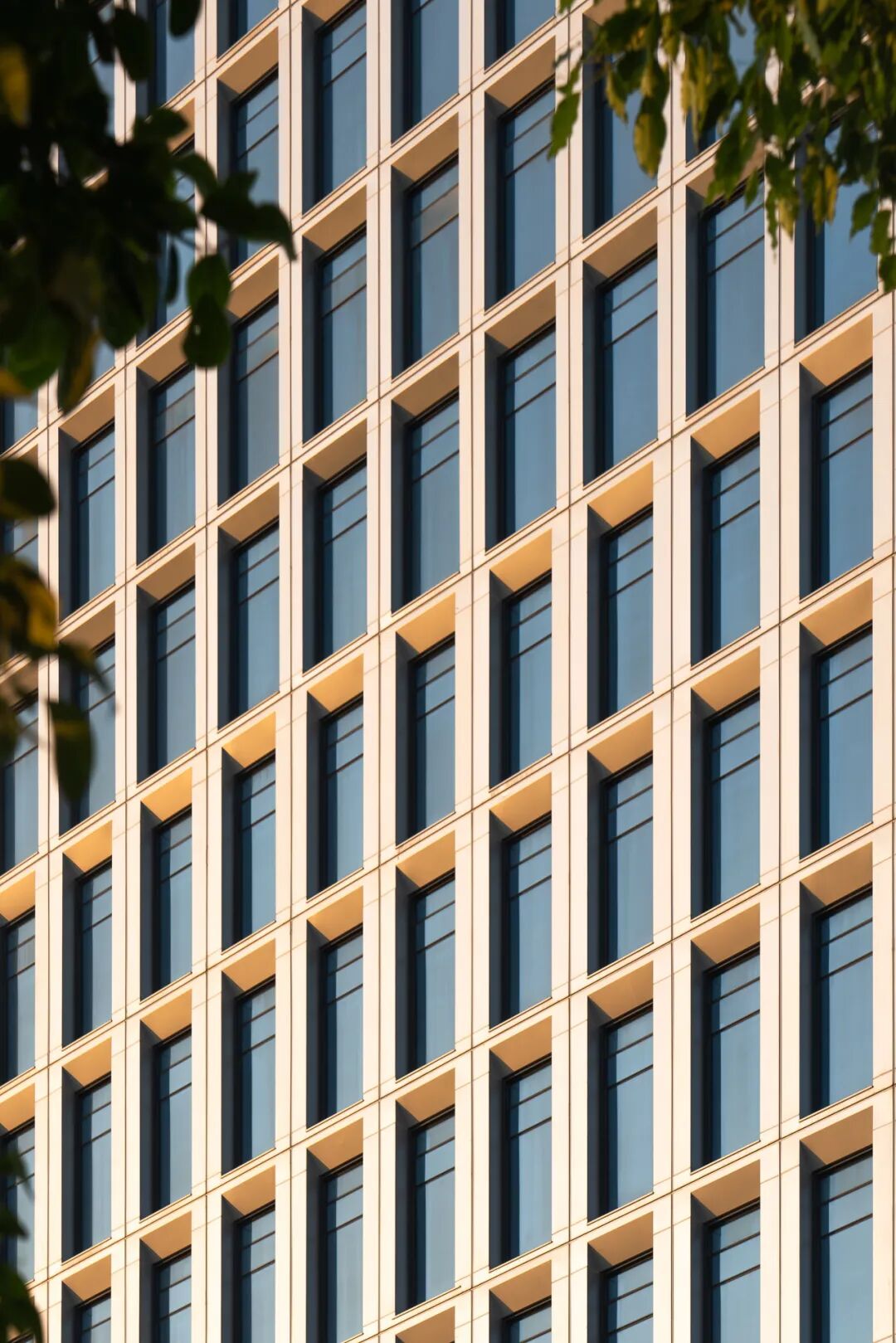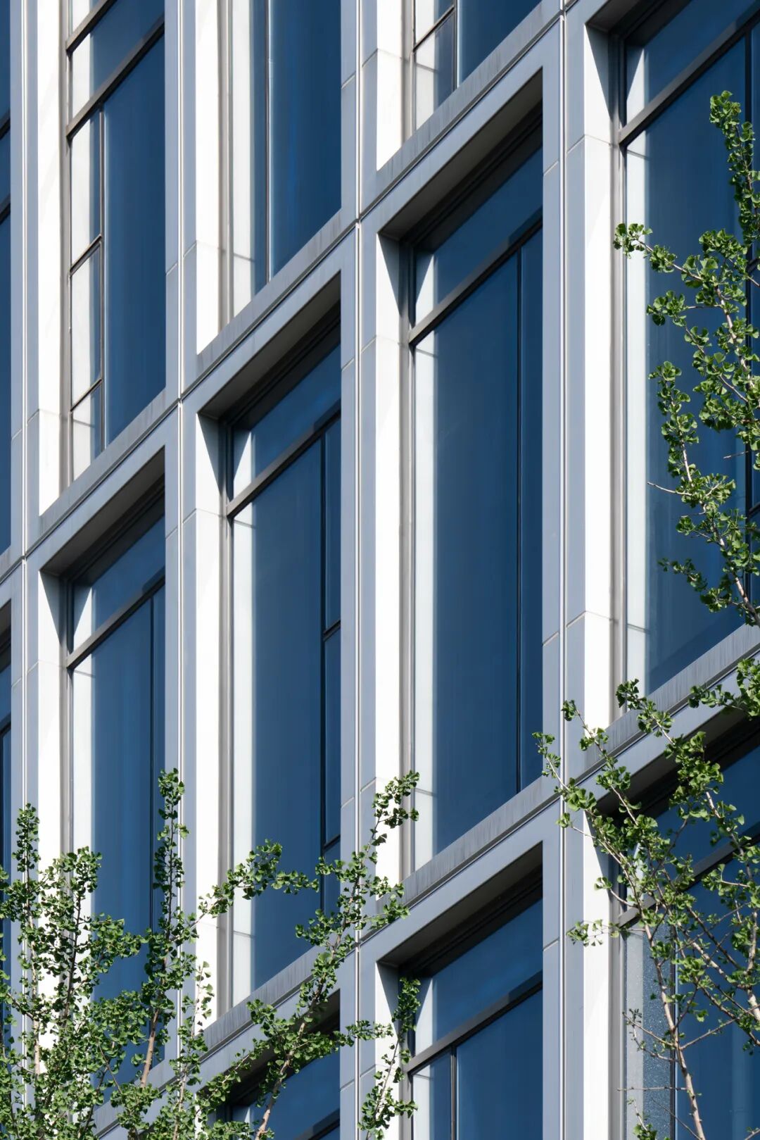 The office tower facade uses metal grilles for a strong vertical order, making the building appear more towering.