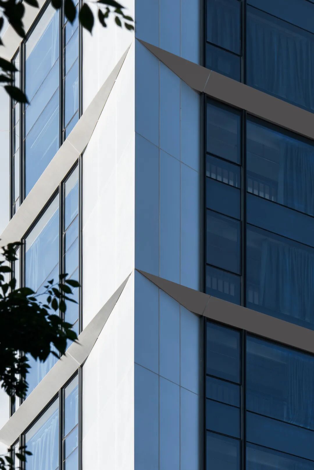 酒店主楼立面自下而上窗框逐渐收窄,在纵向形成微妙的渐变效果。