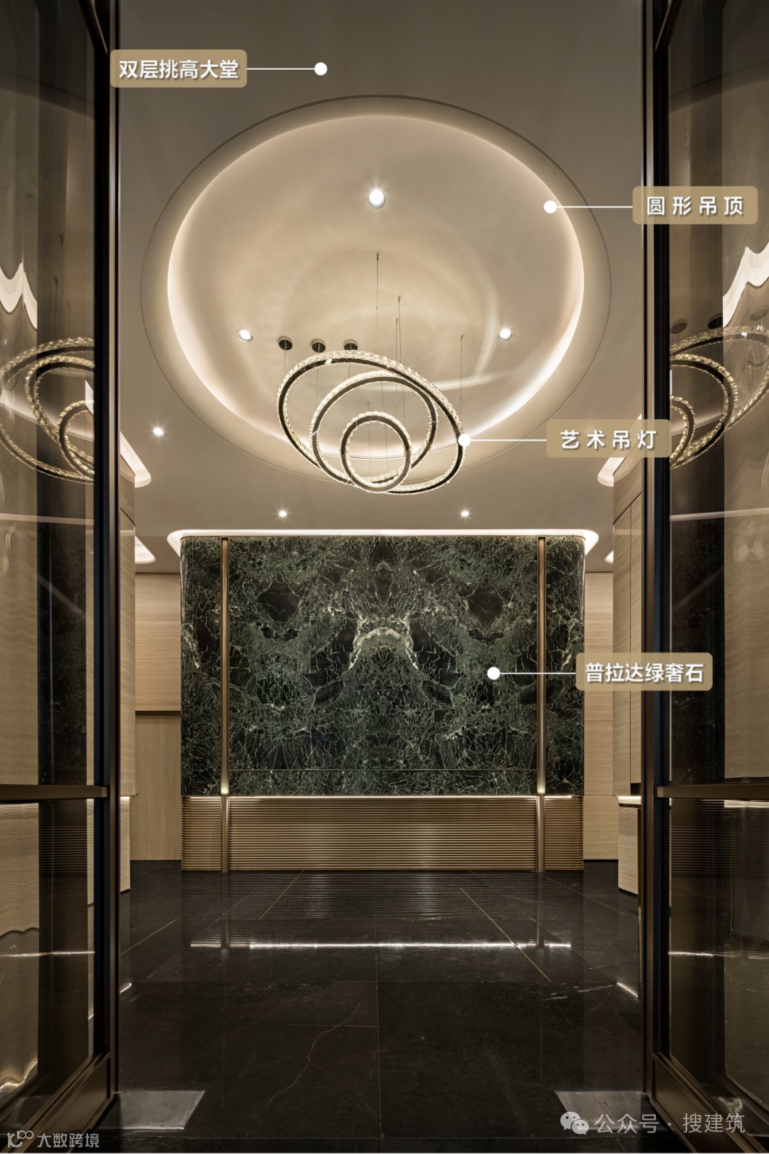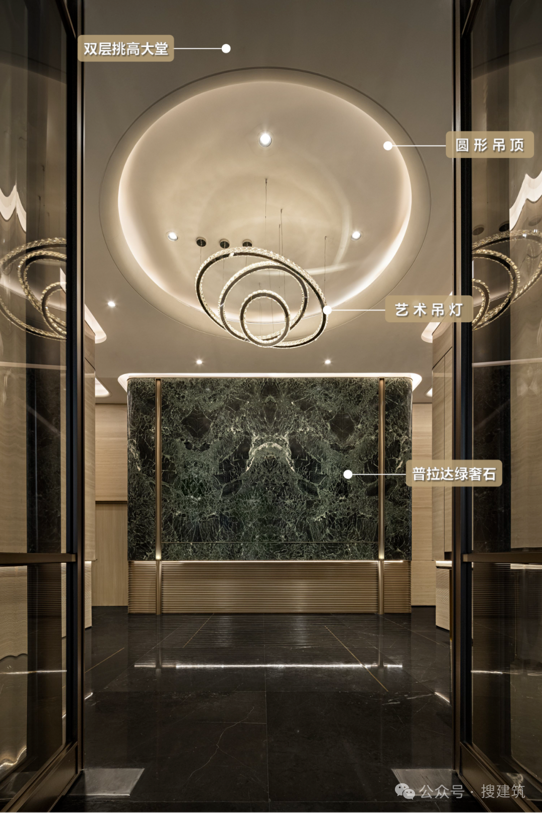 材质上采用普拉达绿奢石墙面,增添了格调质感,从奢华珠宝中,选取颜色、质感与住宅大堂相匹配的单元门把手,弧形金属线条和曲面玻璃,让单元门具有线条感的同时又增加了几分圆润和轻盈,这种感受,就仿佛无边框手机般丝滑。