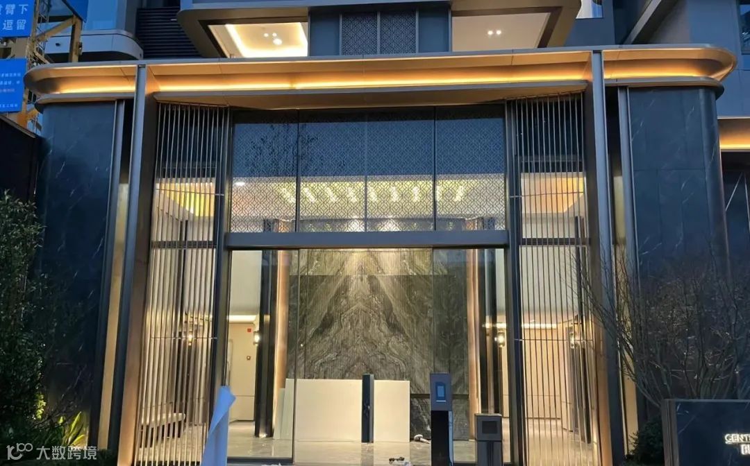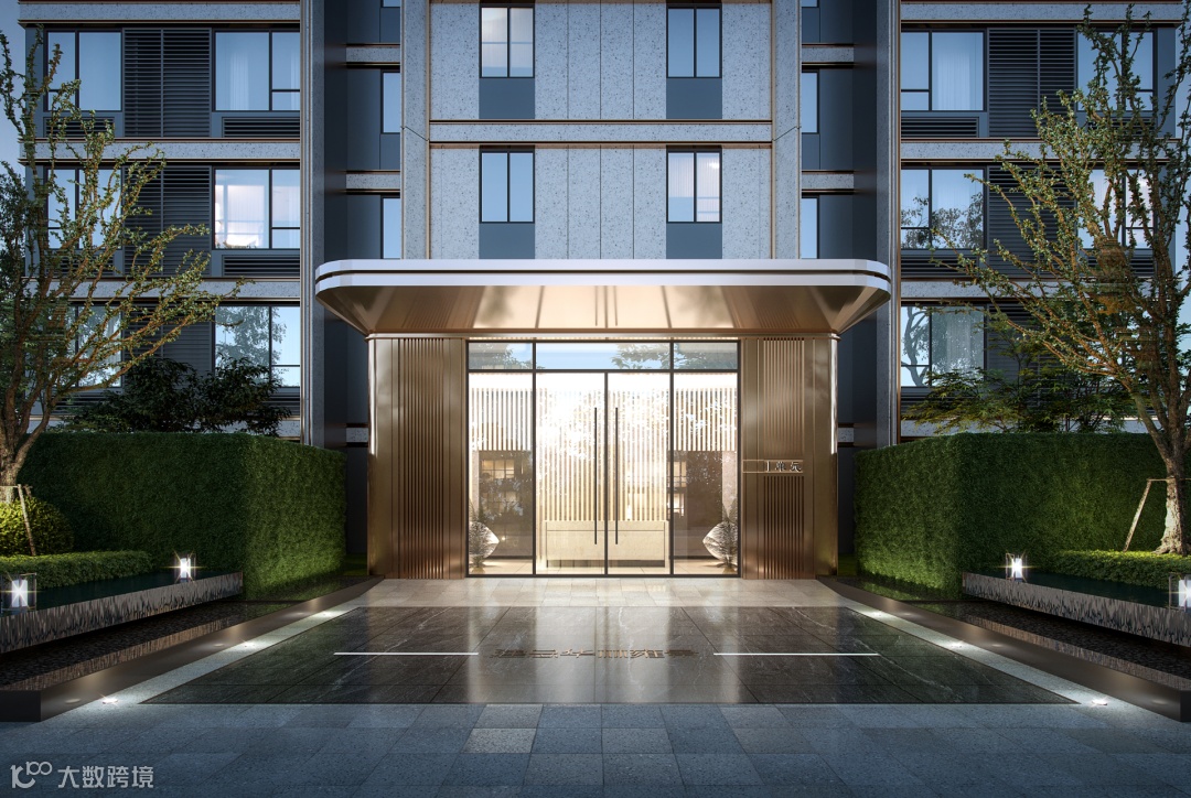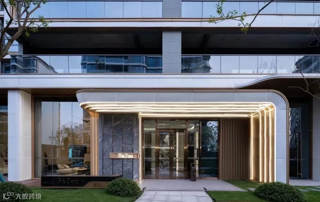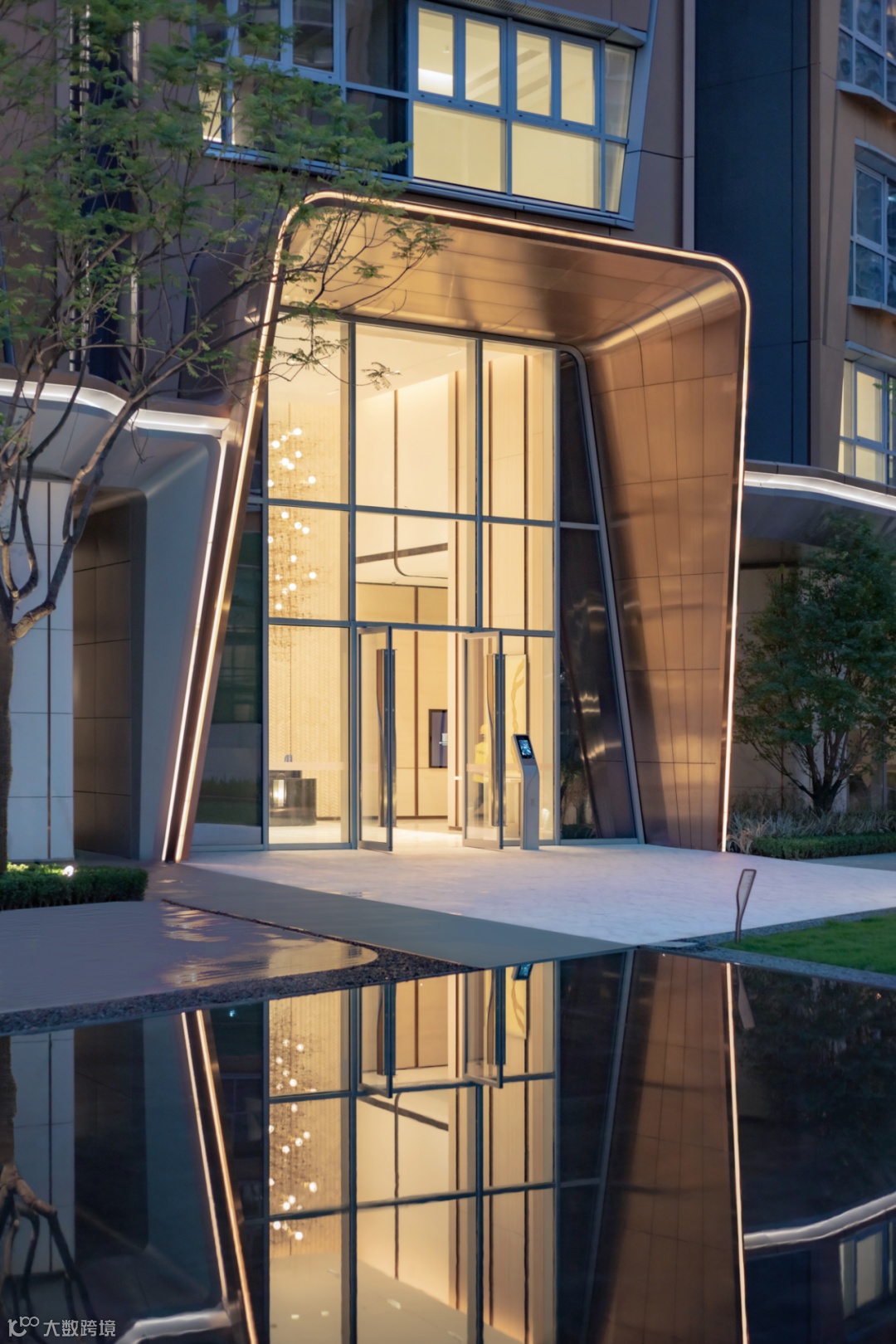 重庆香港置地观宸-正象充满未来感、科技感的单元入口,采用圆弧形铝板,铝板选色相当讲究,3000k暖色调正是肉眼感受最为舒适的色温。