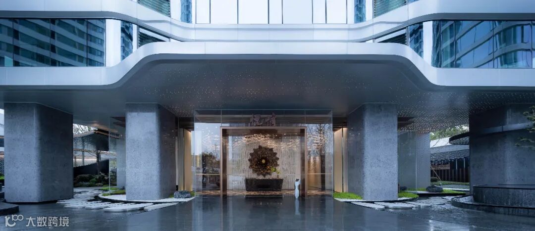 成都D10天府挑高入户大堂三面不设实墙,通高超白玻模糊室内外边界,实现景观渗透。