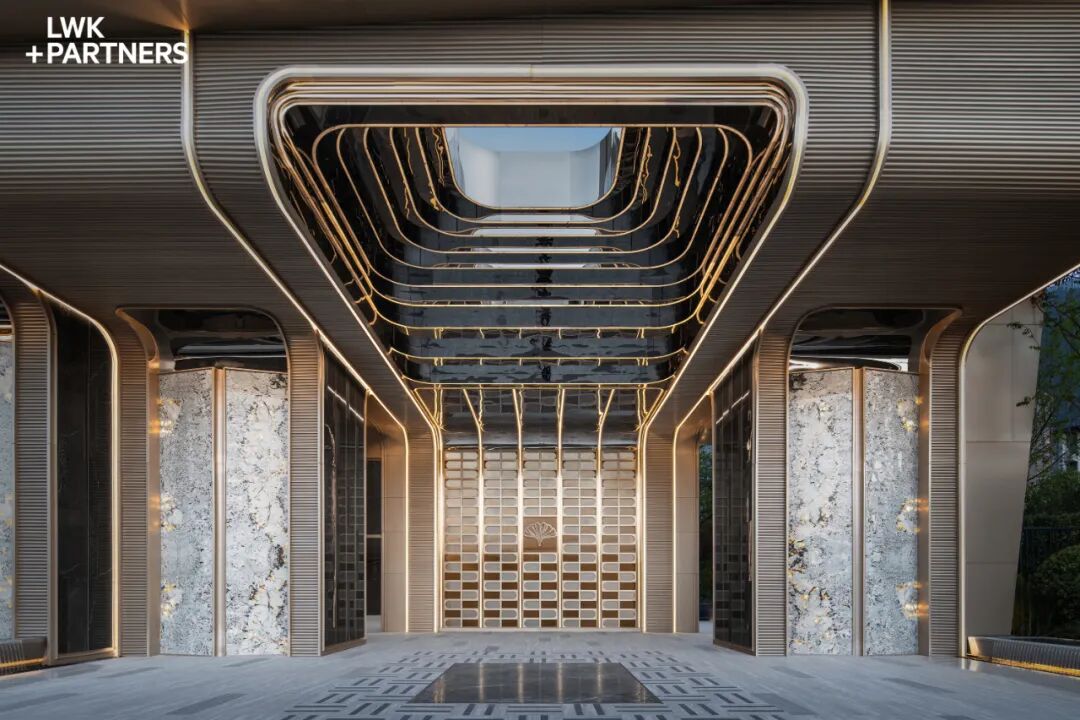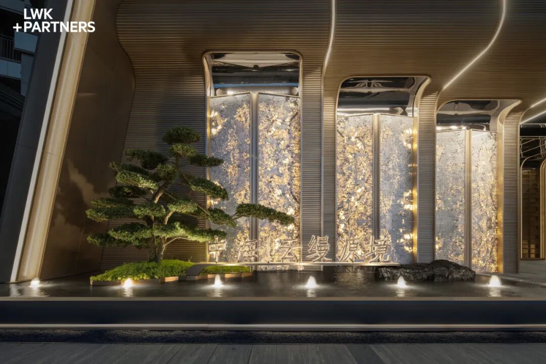 我们希望用“停留”的感受取代“管制”,用“欣赏”的心情点缀“边界”,而传统四水归堂入口的现代化演绎与巨幅屏风表现的画面在这里也拥有了更美妙和吉祥的人文寓意,“内外兼修”的呈现出“友好的城市界面”。