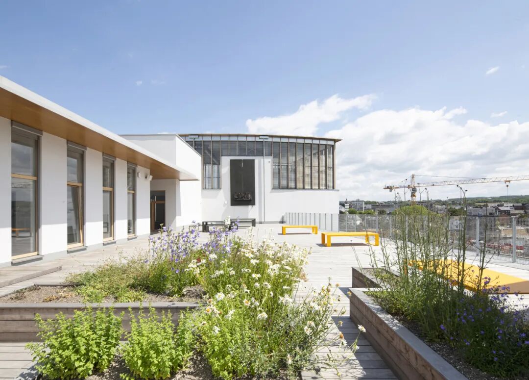 The building - This cultural center sits in the center of Namur, on the north bank of the Sambre River, facing the historic center of the town known as "Le Grognon". Designed by Victor Bourgeois and built at the start of the 1960s, the building required renovation and extension to meet the current requirements of local people and to accommodate the redevelopment of the rue des Bouchers and the banks of the Sambre River. The building used to consist of a 400-seater theatre at one end of a rectangular box-shaped space on four levels with a south-facing curtain wall (looking over the Sambre River) built up against a curved rectangular box-shaped space on five levels, known as the "croissant", which has an east-facing curtain wall and a south-facing end wall which has no openings.
