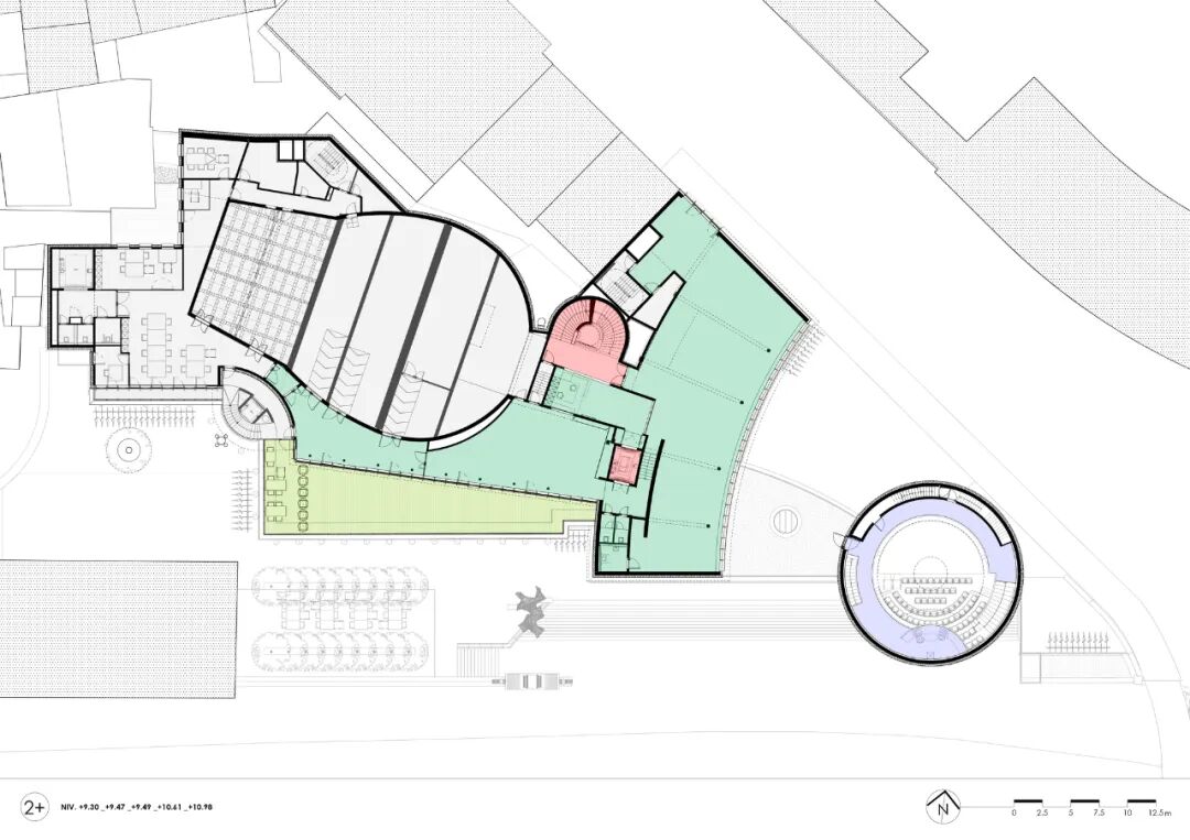 该项目应保留现有建筑(后台区域和场地西北角的附属小型建筑除外)。在可容纳 450 人的主剧场门厅内增加了一个中间夹层,并在 “羊角面包”(第 4 层)顶部增加了一层,扩建部分将满足功能需求。这些扩建部分包括位于 “羊角面包 ”前方的建筑东侧,由接待门廊组成的 “圆柱体”,以及建筑东北侧的重要扩建部分。