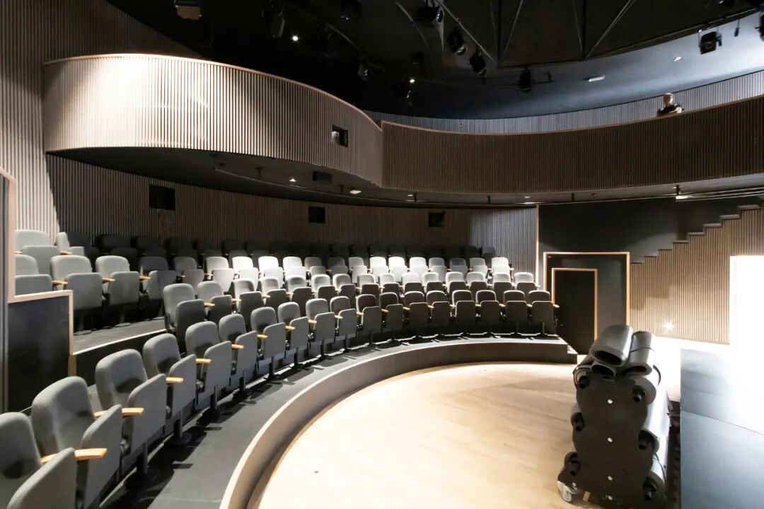 The project shall preserve the existing construction (with the exception of the small buildings annexed to the backstage area and at the site's northwest corner). One intermediate mezzanine was added into the foyer of the 450-seater main theatre, as well as an additional level on top of the "croissant" (level 4), with extensions to accommodate the functionality required. These additions shall include, to the east of the building in front of the "croissant", the "prow cylinder" comprising the reception porch, and significant extensions to the northeast of the building.