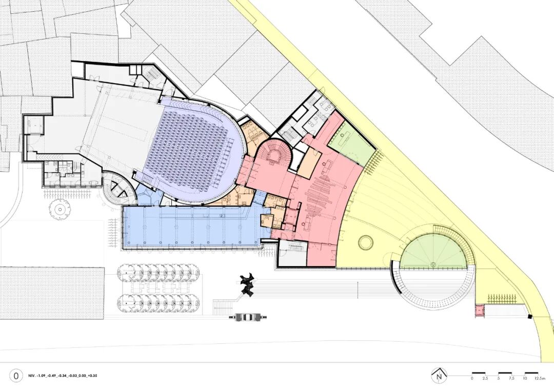 建筑--该文化中心位于那慕尔市中心,桑布尔河北岸,面向被称为 “Le Grognon ”的历史中心。该建筑由维克多-布尔乔亚(Victor Bourgeois)设计,建于 20 世纪 60 年代初,需要进行翻新和扩建,以满足当地居民的当前需求,并适应布歇街(rue des Bouchers)和桑布尔河岸的重新开发。该建筑曾由一个可容纳 400 人的剧院组成,剧院位于一个四层长方形箱形空间的一端,幕墙朝南(俯瞰桑布尔河),与一个被称为 “羊角面包 ”的五层弧形长方形箱形空间相邻,后者有一面朝东的幕墙和一面没有开口的朝南端墙。