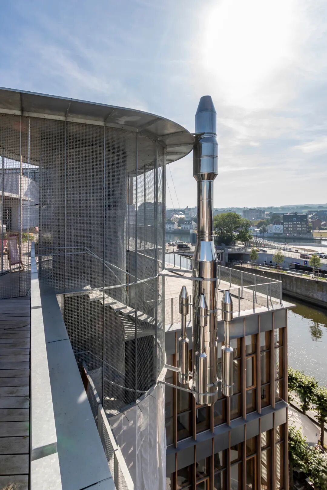 Natural ventilation and acoustics - Although the reliance on natural ventilation and lighting is perfectly possible in a favorable urban environment, the environmental conditions within towns (odors, noise, dust, dirt on floors and walls, overheating, shading) have gradually and very visibly deteriorated. Buildings have increasingly been constructed so to protect them from this hostile environment, becoming "boxes" sealed off from these physical attacks and, as a result, closed off from their surroundings. The center of Namur, which is well-ventilated due to its topography and rivers, is fortunate in that it does not suffer from these disadvantages. It is thus possible to return to more sensible practices and to open up the building to its environment. Since they are sheltered from sources of noise, the main 450-seater theatre roof lights, necessary for both smoke exhaust and natural daylight, can also be used for natural ventilation, along with opening windows.