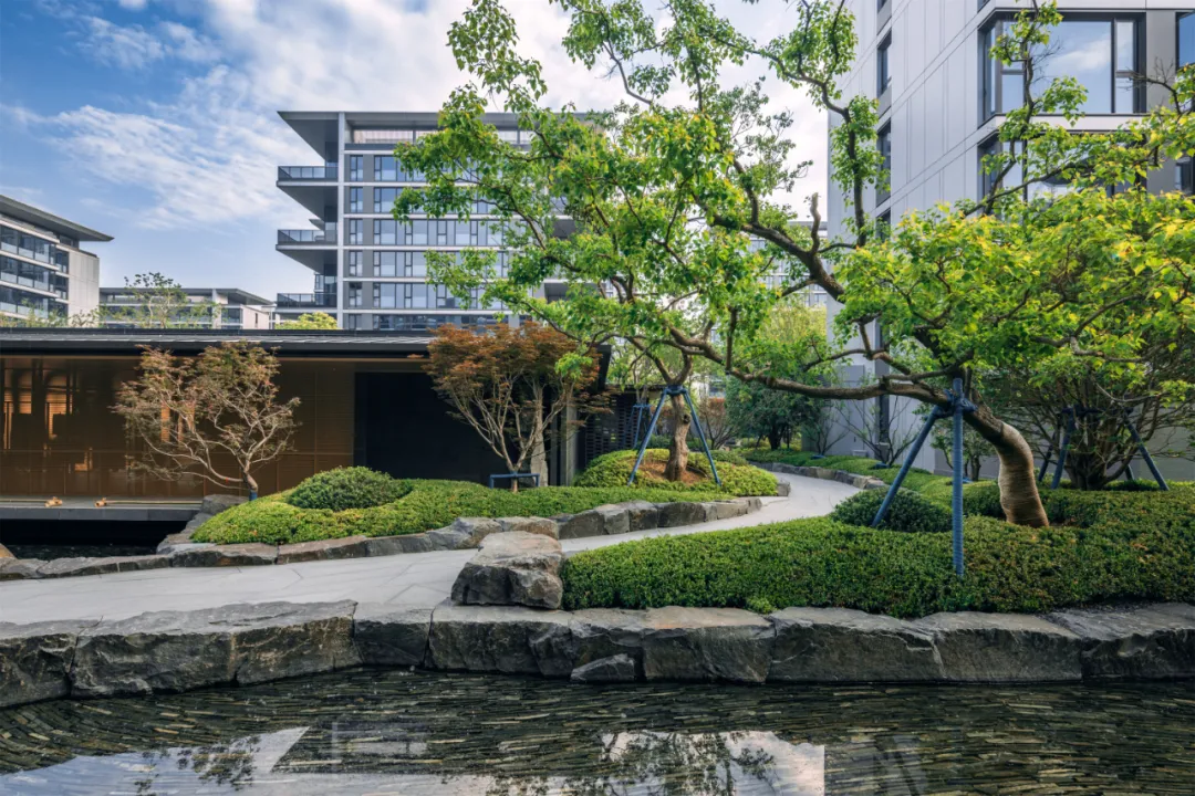 在景观的核心,围合约1100㎡的镜面水景,八株跨越千里,超30年树龄的乌桕树王,带着原生态美静静伫立,意蕴悠远。
