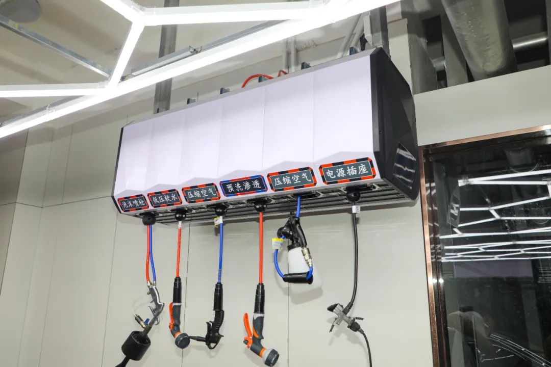 洗车房内每个汽车部位都有特定的清洗工具,各种小刷子、清洁剂等一应俱全,还配备有吸尘器、洗衣机、组合卷管器等专业设备。