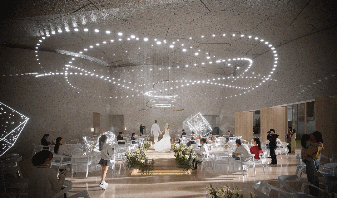为进一步丰盈酒店功能,我们在酒店中轴线左右置入交通核心。作为垂直交通枢纽串联起婚庆、康养、餐饮等功能区域,既保证了各功能区的独立性,又通过交通核实现高效的可达性,为游客提供一站式服务体验。