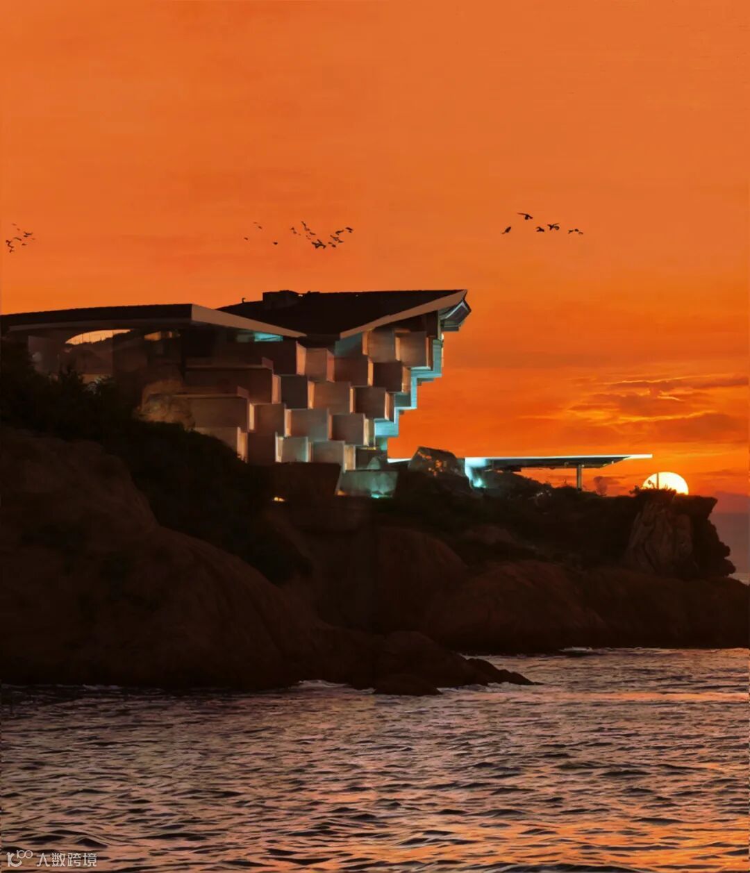 此外,设计通过光影效果,使建筑在夜晚更凸显其独特的几何形态和材质纹理。建筑伫立于海边,远望花鸟悬崖酒店,宛如海上灯塔,与星空相辉映。