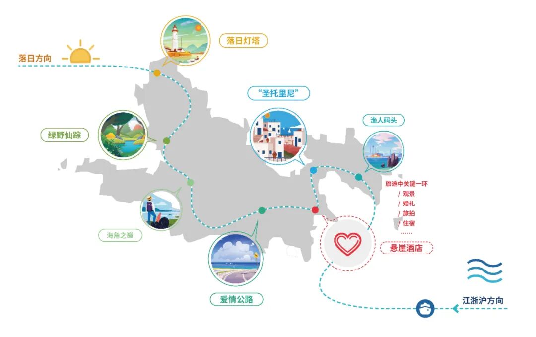 北岸的花鸟山灯塔,长久以来都是花鸟岛的名片,而如今,龙舌嘴对于来往南岙码头的游客,已成为重要的自然地标与形象展示面。为强化旅游IP,我们期望龙舌嘴海岬制高点上的悬崖酒店,凭借其独特的地理位置、建筑风貌和内容运营,成为具时代和地域特色、富有标识性和记忆点的“爱情灯塔”地标。