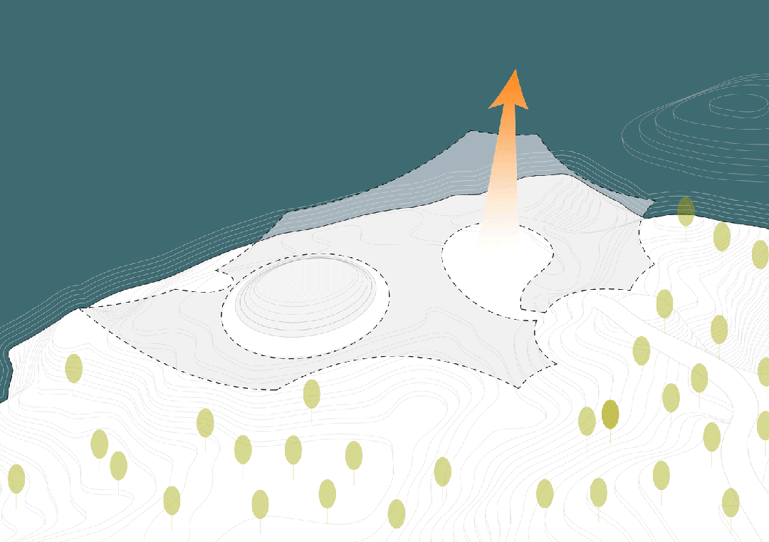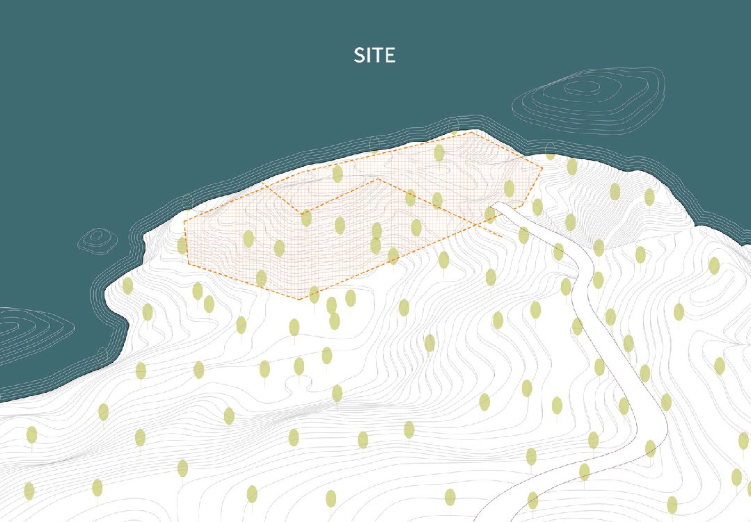鉴于场地内建筑的容积率所限定的体量为恒定状态,我们聚焦于挖掘建筑与地形间平衡点的多种可能性:或凌驾于地形之上,全貌彰显;或隐逸其下,含蓄内敛。为诠释建筑与地形间的和谐共融,我们最终选择顺应岛屿脉络,建筑结合地形自然延伸。