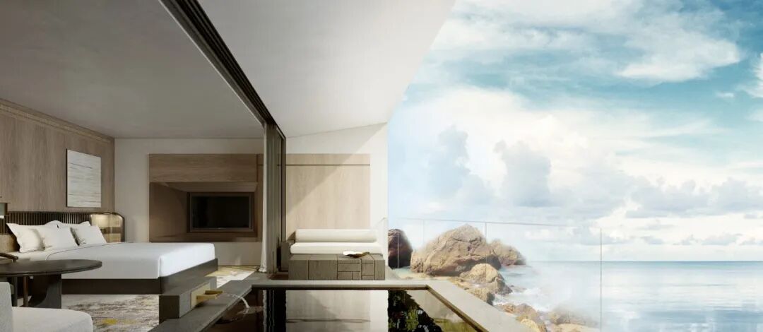 建筑主体设置于一片人工地形之下,中部起翘,设置从酒店入口到海景的核心中轴线,两侧客房层层出挑,强化标识性,将其打造为具备区位意义的“时代灯塔”。