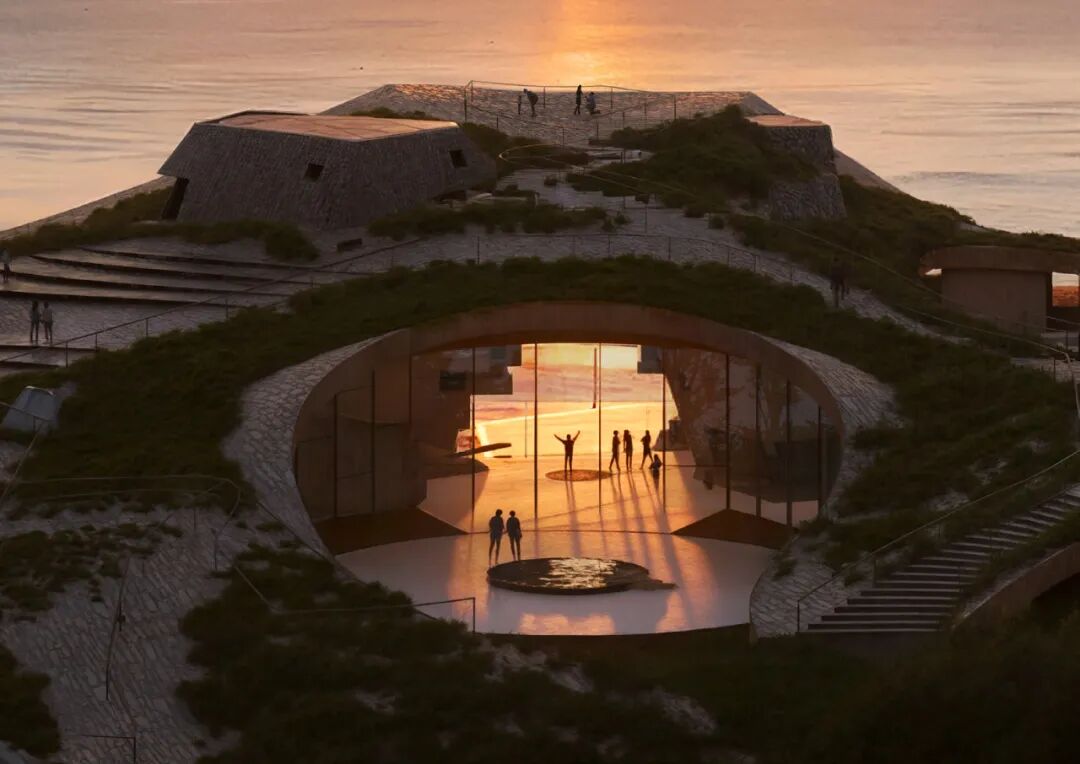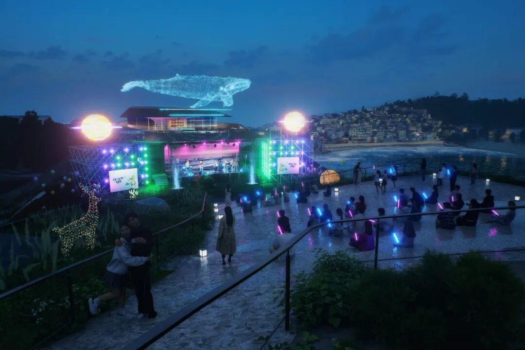 场地面朝大海,道路蜿蜒而入,飞鸟和人群向此汇聚,空间和活动由此产生。建筑形态宛如水珠滴落,大地似水花掀起,向着海景打开。