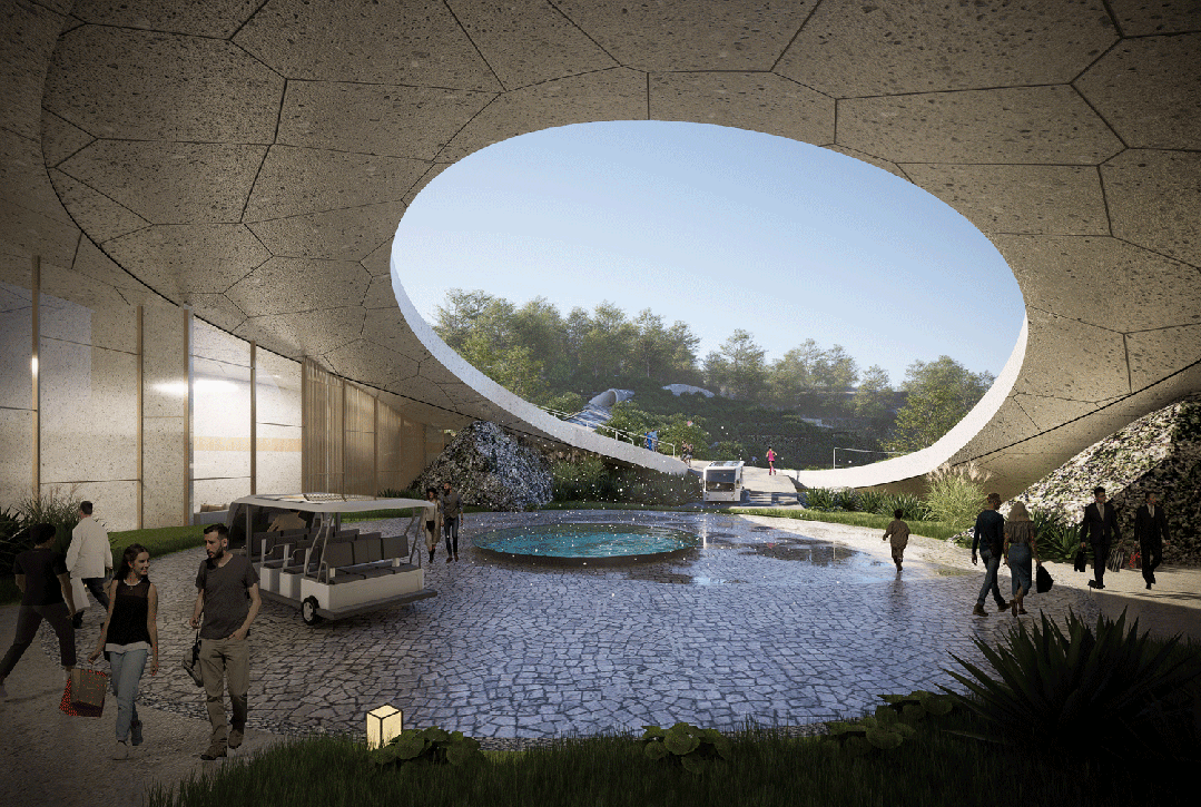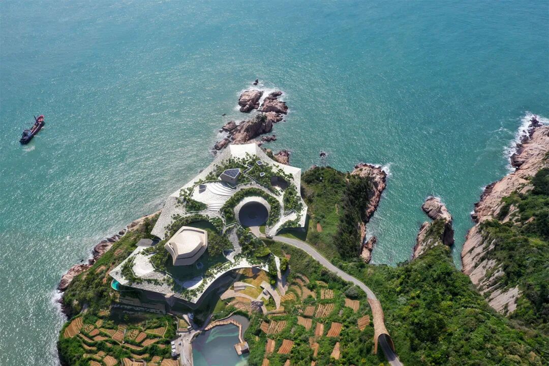 与核心居住区用地受限不同,场地拥有大片可延伸和扩展的用地面积,坐拥最优质的海天之景,因此我们打造向岛内延展的人工地形。面向岛内,建筑屋顶如掀起的大地,是岛屿生态景观的延续,也是游客活动的空间场所。