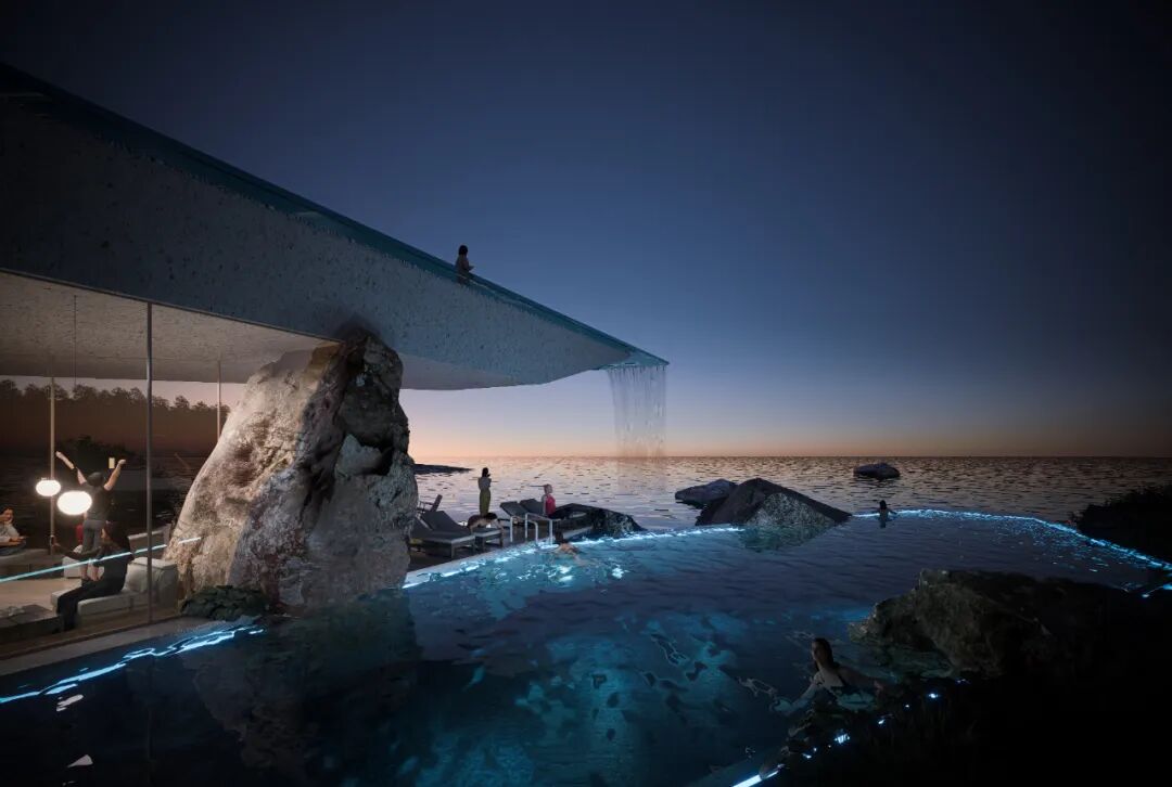 水花形态塑造了屋顶的起伏,绵延延伸,屋顶顺应地势变化,步行系统延伸至屋面,覆盖整个酒店。进而完善屋顶绿化,将其融入海岸,并最大化利用海岸景观。