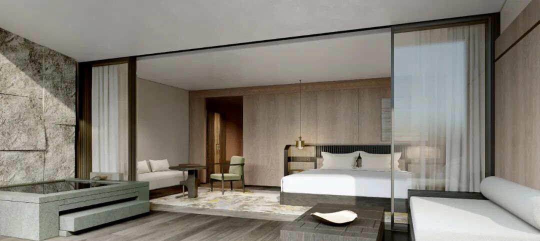 外立面采用与岛屿岩石质地相似的天然石材,石材铺装延续岛屿自然肌理,步道如同天然形成的路径,提升整体环境的自然感受。