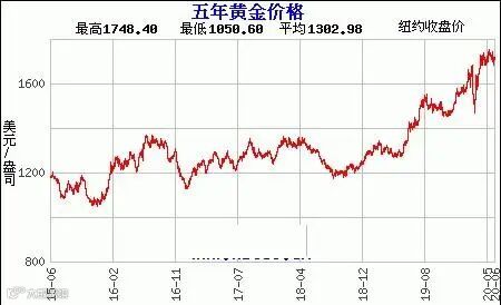 人们认为黄金可以抵御通胀,是全世界的硬通货。黄金从2015年最低1045美元每盎司,到今年最高1748美元每盎司,涨幅达到67%。