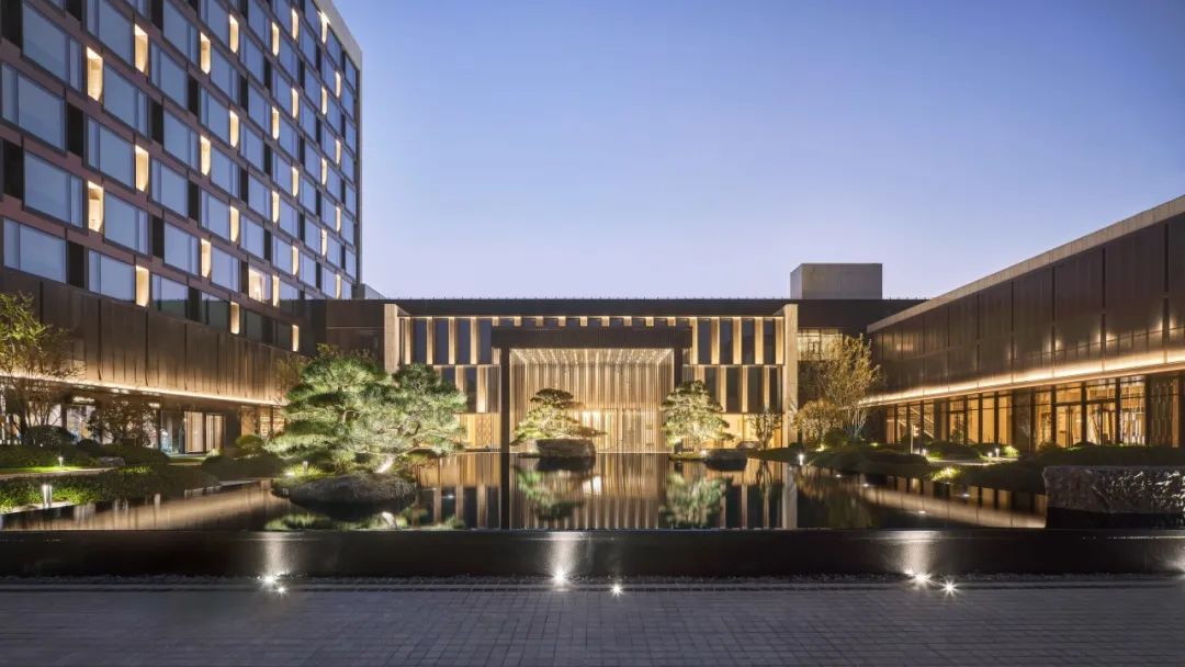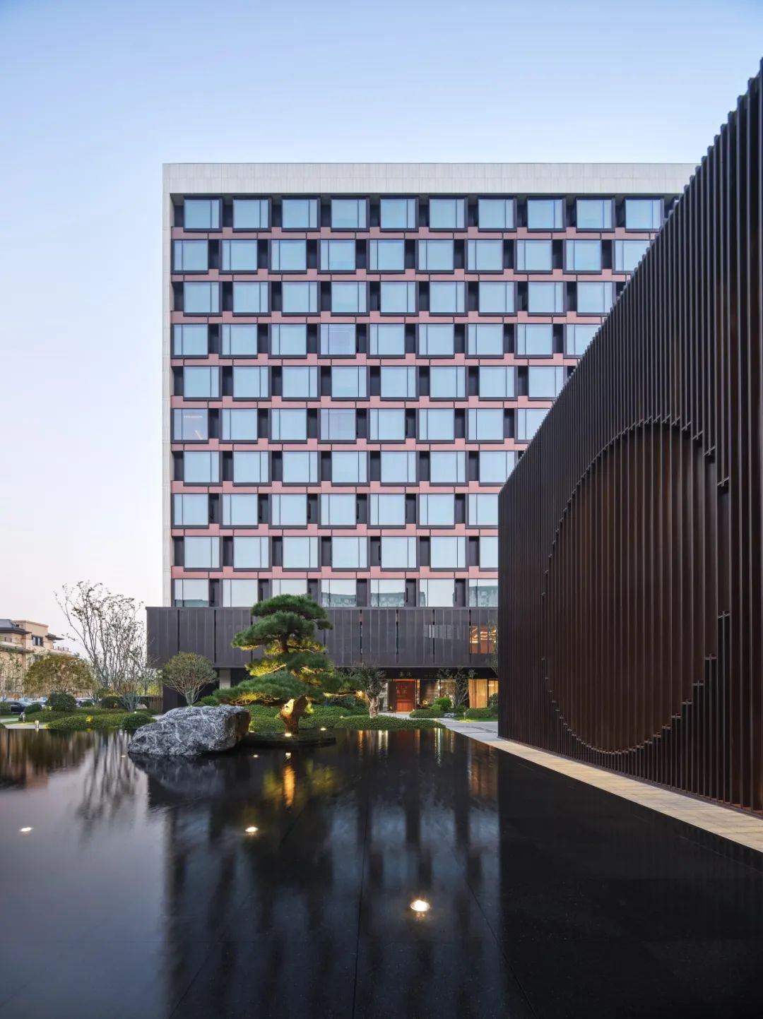 主楼建筑设计提取斗拱元素,利用客房单元造型相互搭接,形成独特韵律。石材、铝板与玻璃的交替使用,光与影的交错效果,既融入了现代建筑的简洁与线条感,又彰显了传统东方美学的精致与优雅。