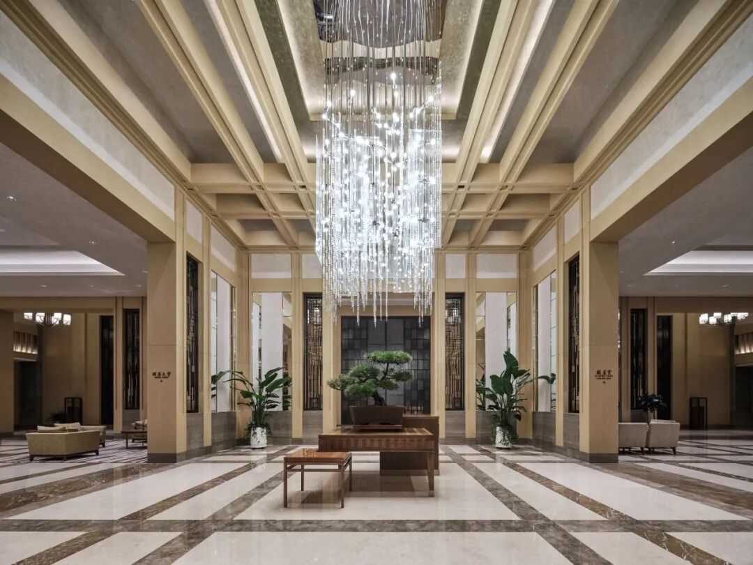 千人宴会厅配合灵活的内部隔断可满足多种使用场景。大厅散发着浓郁的东方韵味,落地窗引入室外优美的园林景色,在室内装饰中使用木材、石材等天然材料,增添质感与优雅气息。