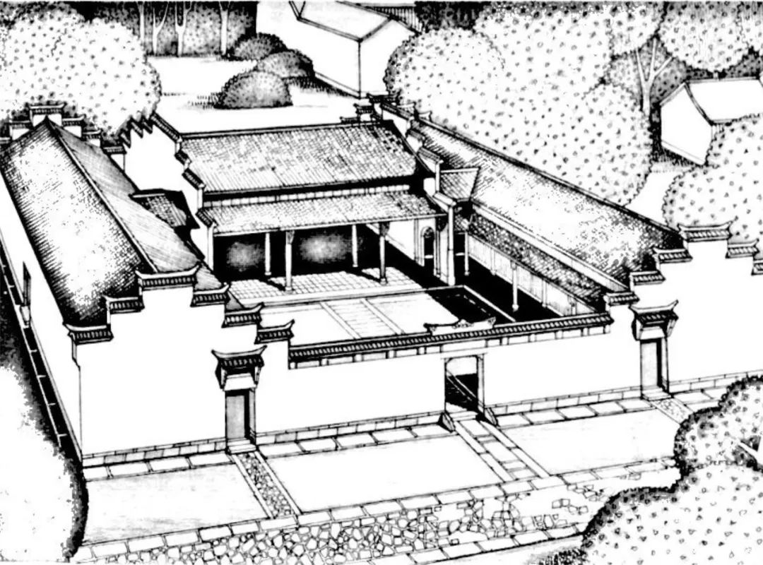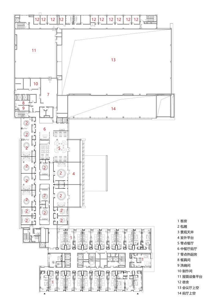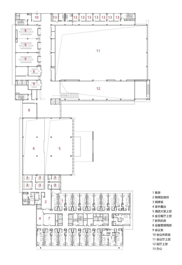东阳传统的大中型住宅多数采用当地称为“十三间头”的形式。“十三间头”是由正厅三间加左右厢楼各五间共十三间房屋组成的三合院。大型住宅往往由这种“基本单元”纵横拼接而成,形成中轴对称的空间布局。本项目提炼东阳传统住宅“十三间头”布局特点,以现代的手法再现传统的空间记忆。