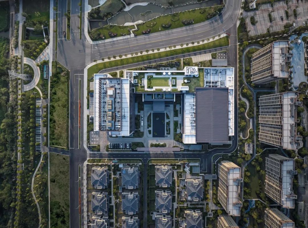建筑色调提取东阳古民居特点,既展现江南建筑的审美逸趣,也与周边新中式风格的建筑群相得益彰。入口雨棚正立面以深棕色金属格栅排布组合出传统月亮门造型,虚实之间展现了烟雨江南的朦胧意境。
