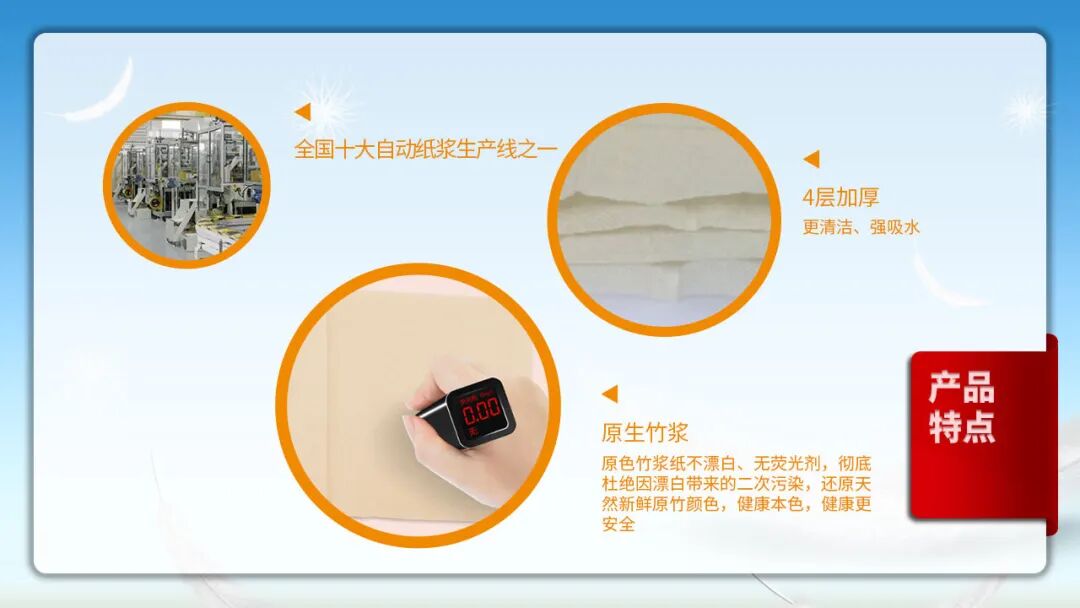 纸张为淡淡的黄色,为生活增添不一样的颜色。它是由竹子做的,竹纤维中含有一种叫“竹醌”的成分,天然抑菌。给您天然的爱和健康的生活。