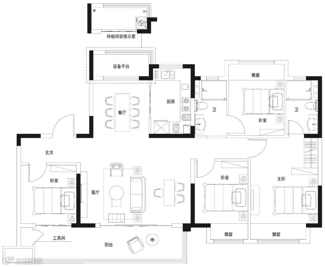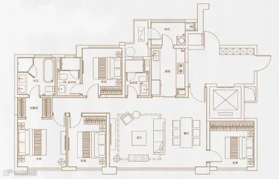 旭辉敔山公元项目165平四房户型,整体非常方正,有三个房间朝南,客厅面宽约6.6米,能放下环形沙发,阳台约9.2米,休闲空间足够大。
