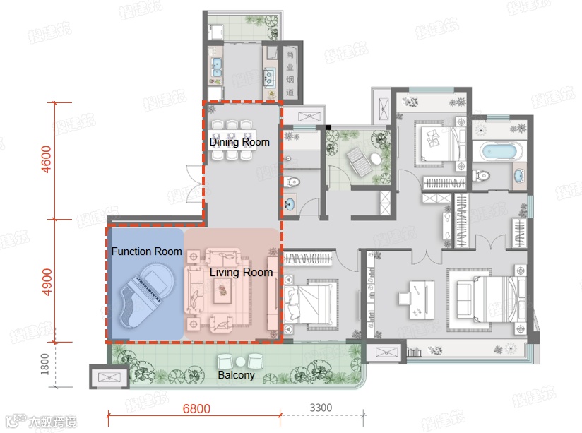 首创天阅嘉陵这个建筑面积约188㎡的户型整户有约17m采光面宽,多功能厅设计,生活更加丰富多彩。长约10m,面积约18㎡的景观阳台,全明采光,实在是太诱人了。