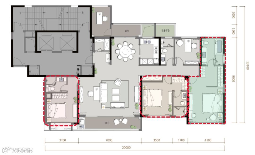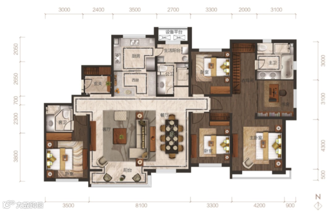 245平的“4+1”户型,整体开间超过了20米,进深11.3米。横厅开间达到8.1米,双套房设计。