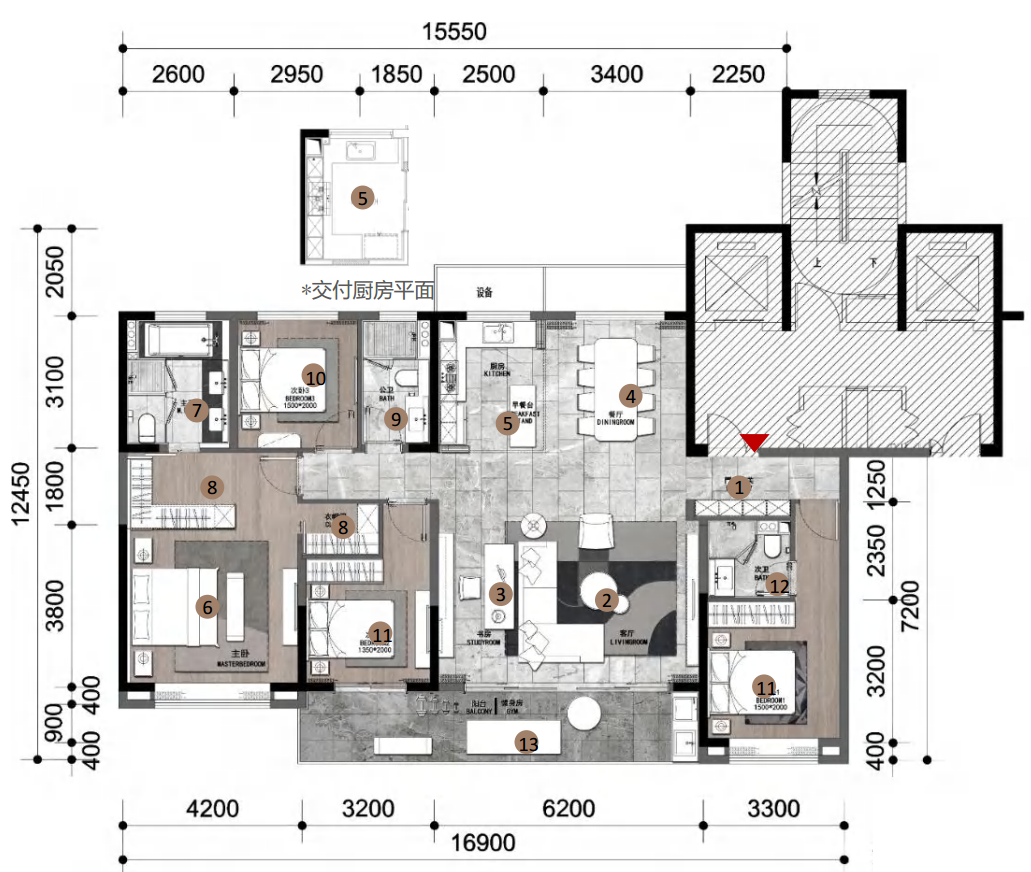 同样杭州棠玥湾洋房神164㎡户型。所有卧室开间都很舒适,主卧套开间达3.9米,次卧套3.3米。南向总面宽达15.9米,阳台足足有8.7米长。