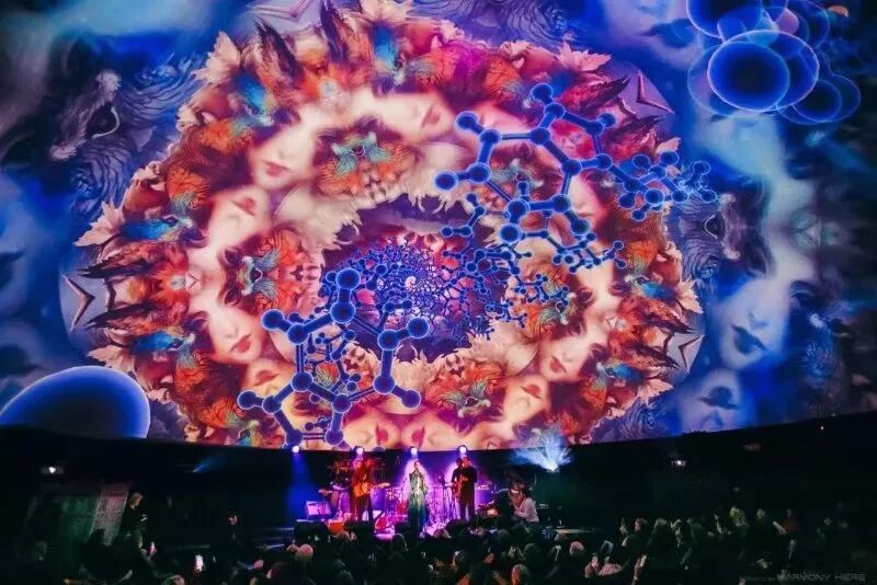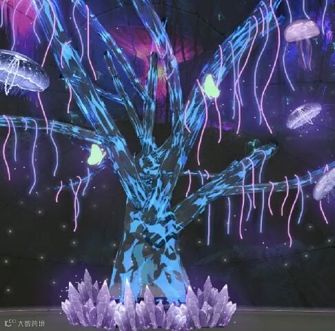 利用8M直径的球体空间,呈现一个”水晶星球“,球体内放置一颗拔地而起的水晶生命树,树体晶莹发光,树干垂挂着许多不同长度的发光纤维条,变幻颜色;空间中到处飞舞着神秘的发光生命体,给人一种清凉而梦幻的体验。