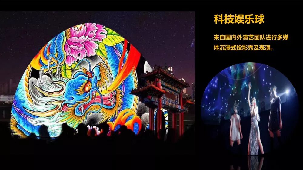 来自文旅演艺界艺术家的21个用声、光、影、机械装置、5G智能、体感交互、增强现实等科技装备结合自然、舞蹈、文化、艺术、游戏设计的沉浸式体验穹顶空间。21个艺术球分三个区沿江排列开来,如浦江沿岸散落的一串明珠。