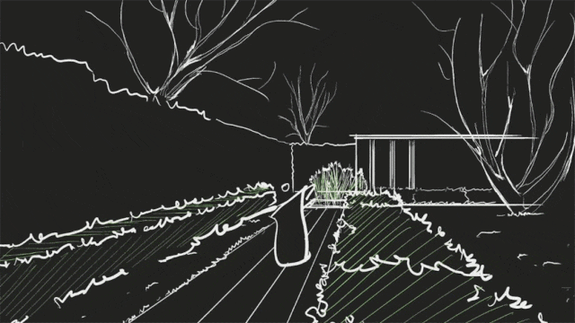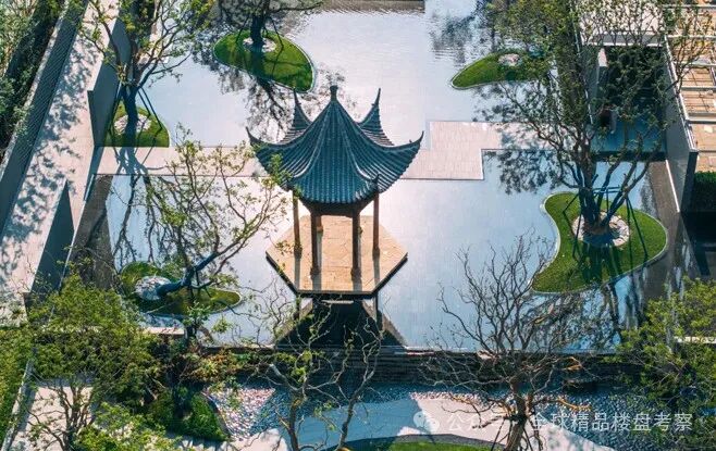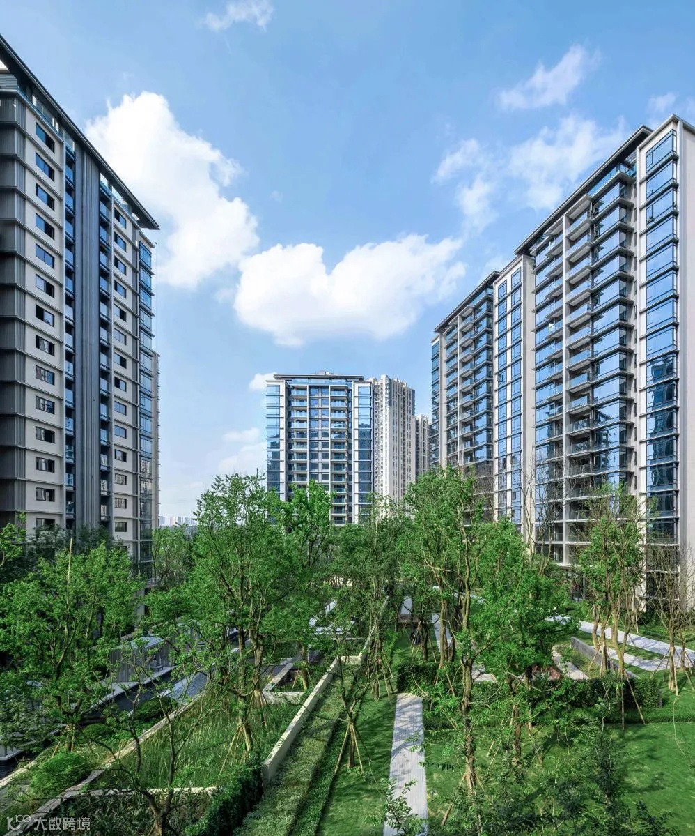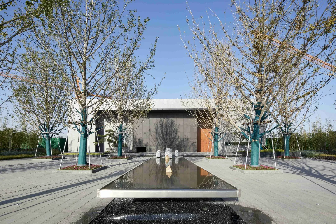 设计当中,运用森林元素和园林小品,将森林和城市之间结合起来,通过在院落之间,植物和景墙形成空间的转换和半围合的空间,步移景异,形成人视角最大化的景观视线。