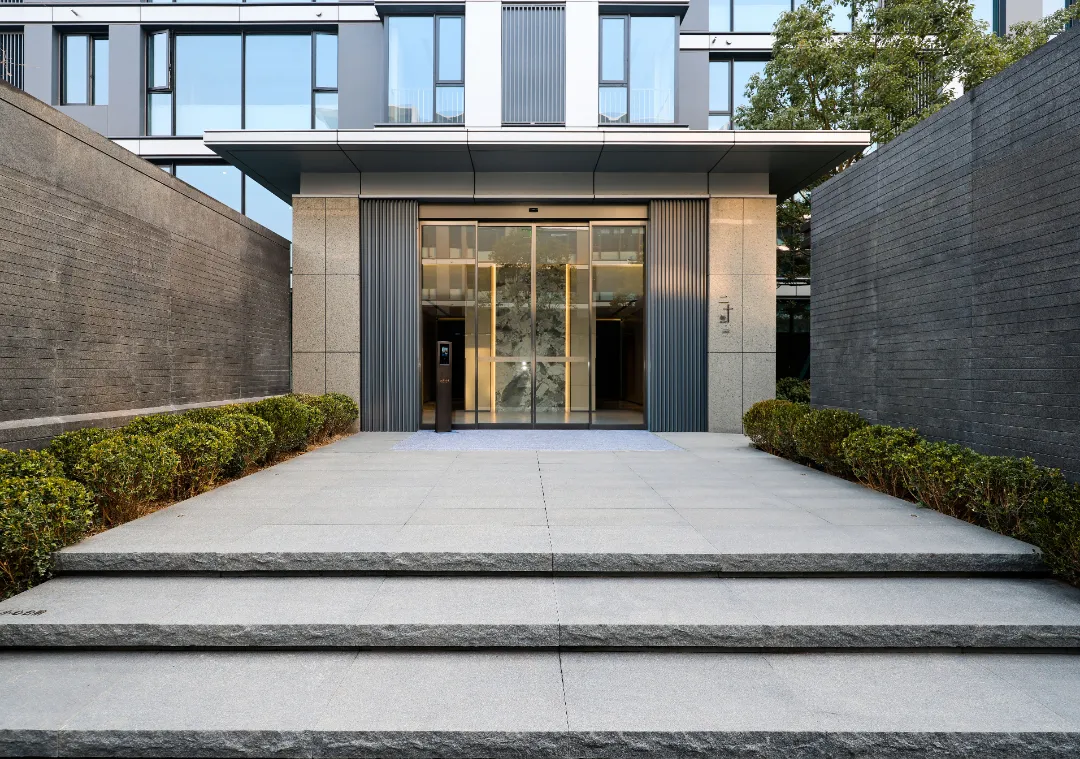 一楼私家小院入户门,通过色彩、材质、图案、弧线等元素进行叠加、升级,构建不一样的生活理念。