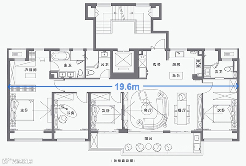 成都花样年·望花溪建筑面积约172㎡户型,三房三卫,该户型面宽约16.1米,端厅布局,动静完全分区,其中客餐厨面积约78平米,配上11米长270°转角阳台,整体面积超过100平米,这种尺度的公共区域相当奢华,完全不亚于200多平米的豪宅水准。