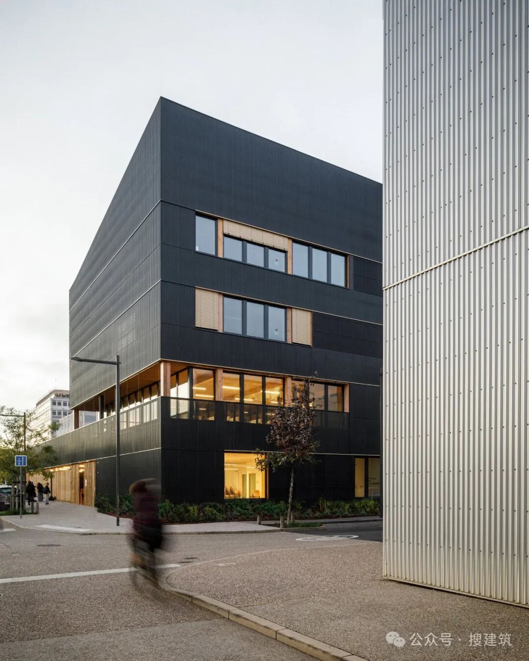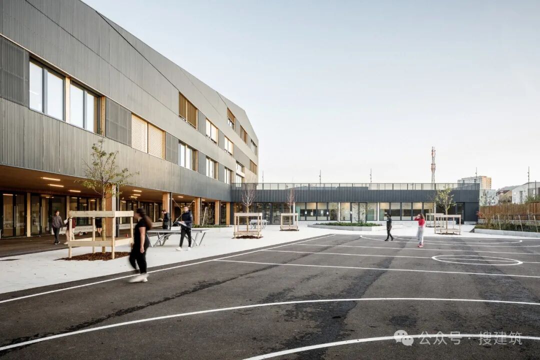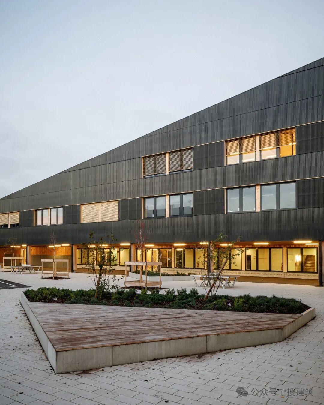 该项目以环保为目标。尼基-德-圣法勒中学的设计采用了被动式建筑(Passivhaus),采用木质框架和稻草隔热材料。这是大区的第一所正能量学院,也是法国第一所用木材和稻草建造的 R+3 ERP。无论是在材料的选择上,还是在结构的紧凑性和功能的分布上,简洁的设计都给人一种自由的感觉:灵活的体量和可扩展性,适应了中学不断更新的内部生活。