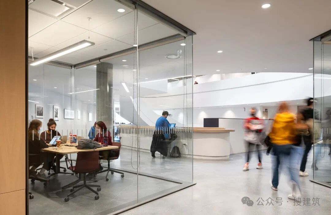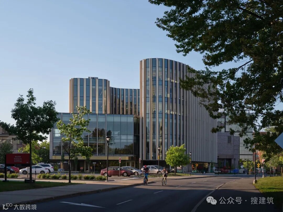 外部采用了大胆的垂直预制鳍片,将六层楼高的建筑包裹起来,以减少太阳辐射热,并突出其曲线形状。裸露的混凝土地板可以承受高流量的使用,是一种与设计美学相融合的节约之举,与各种天然材料(如当地采购的石材和橡木)形成鲜明对比。在冬季漫长的气候条件下,该建筑营造了一个舒适、光线充足的空间,并位于校园人行隧道系统的中心位置。