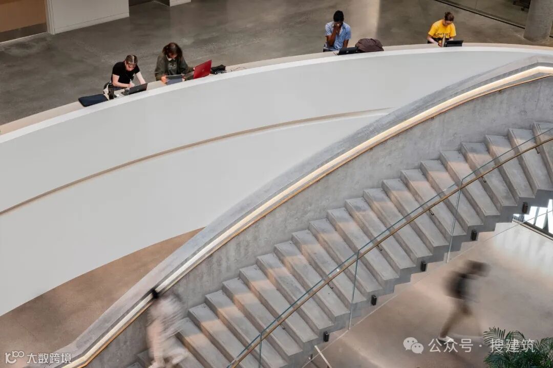 主要的设计理念是一种诱人的弧线造型,这种柔和的弧线内外兼修,让人一进门就能感受到整个学校的活力。从中庭的天窗向外辐射,中心的聚会空间清晰可辨,一览无余。底层设有一个咖啡厅,并通过一个蜿蜒的特色楼梯通向上层,在这里,玻璃帷幕的教室和休息空间为学生提供了教室以外的技术学习和合作机会。