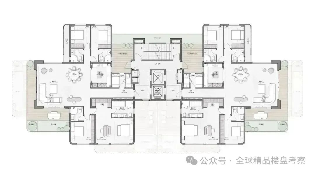 建面约170㎡偶数层户型为例,做到了大别墅才有的“爽点”。五开间朝南,采光率更高,生活起居面面向阳。四房两厅三卫南向双主卧设计,独占空中景观,这也是奢宅的无形资产。