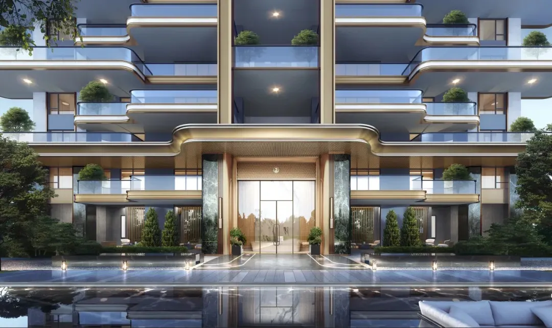 广宇设计采取元素符号景观提取转译,将景观元素应用于立面高层大线条处,通过再设计实现丰富观感;将古建元素应用于高层转角阳台,通过弧面玻璃反射效果,形成兼具传统美学与文艺美学特征的立面形象,影显项目的独特性和尊贵感。建筑长出森境,自然包裹立面,层层叠翠,筑就一座会呼吸的城市“森林”。