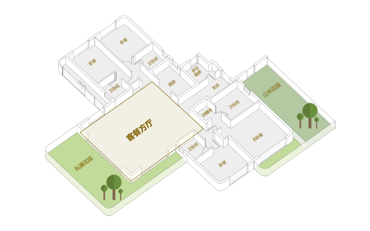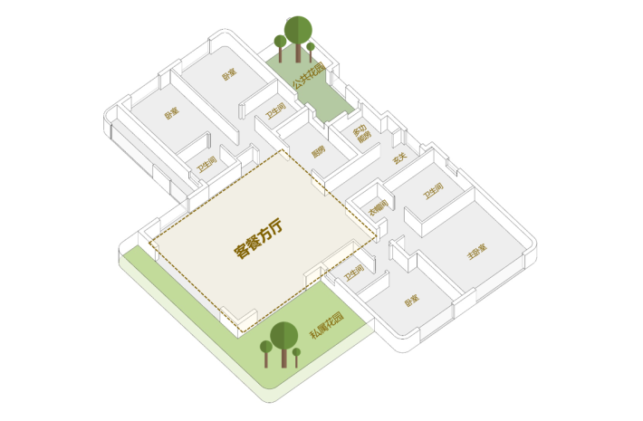 客餐方厅整体凸出,270°生态景观花园始终围绕客餐厅奇偶层错位设置,家庭生活中所有的公区活动都可以与室外有机联系。